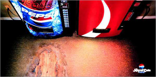 این دو غول تولید کننده ی نوشیدنی های بدون الکل، همیشه در حال رقابت و جنگ تبلیغاتی علیه یکدیگر بوده اند. گاهی این تقابل به مسخره کردن شرکت و محصولات دیگری هم کشیده شده است.پپسی : کوکاکولا طبقه دوم این ساختمان را برای دفتر بازاریابی و فروش محصولات خود خریده است و در مقابل آن تابلویی با عبارت : "کوکاکولا، در طبقه دوم" را برای راهنمایی مراجعه کنندگان نصب کرده است. چند روز بعد، پپسی، تابلویی را در کنار تابلوی کوکاکولا نصب می کند با این عنوان : "پپسی، همه جا" !